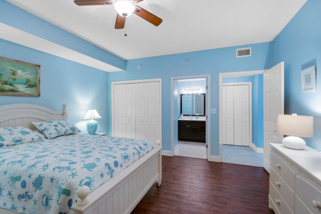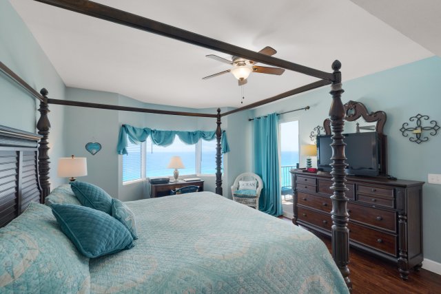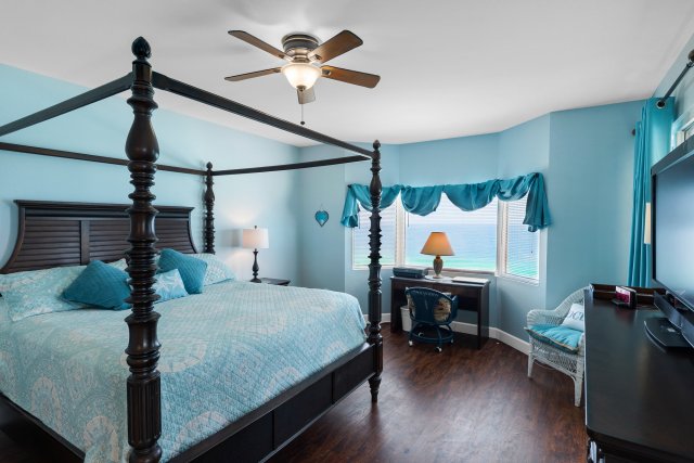 The oversize front master bed room has a beautiful view of the ocean and private access to the large balcony. In the master there is a bay window and table that has its own panoramic view, this is perfect for a quiet place to work or eat breakfast in peace! This room has a large plush King size four poster bed with a flat screen television. The master bathroom has an oversized shower with two shower heads, one is an amazing waterfall. The master bath also includes his and her sinks along with a large walk in closet.