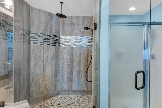 The third bedroom is huge with a queen size bed with plenty of room for a crib or pack and play. It connects to the third full bathroom with a dual-head shower/tub combination.