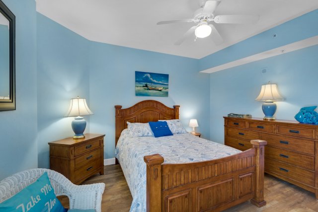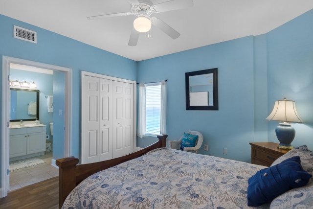 The second large bedroom has a view of the Gulf. There is a deluxe Queen size bed along with a flat screen television and a large size closet. It has its own full bath with a dual-head shower/tub combination.