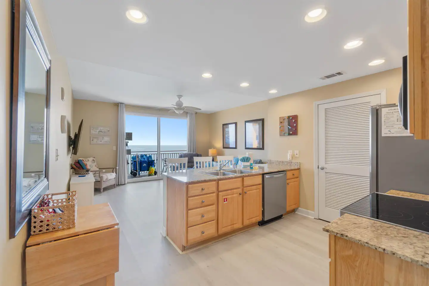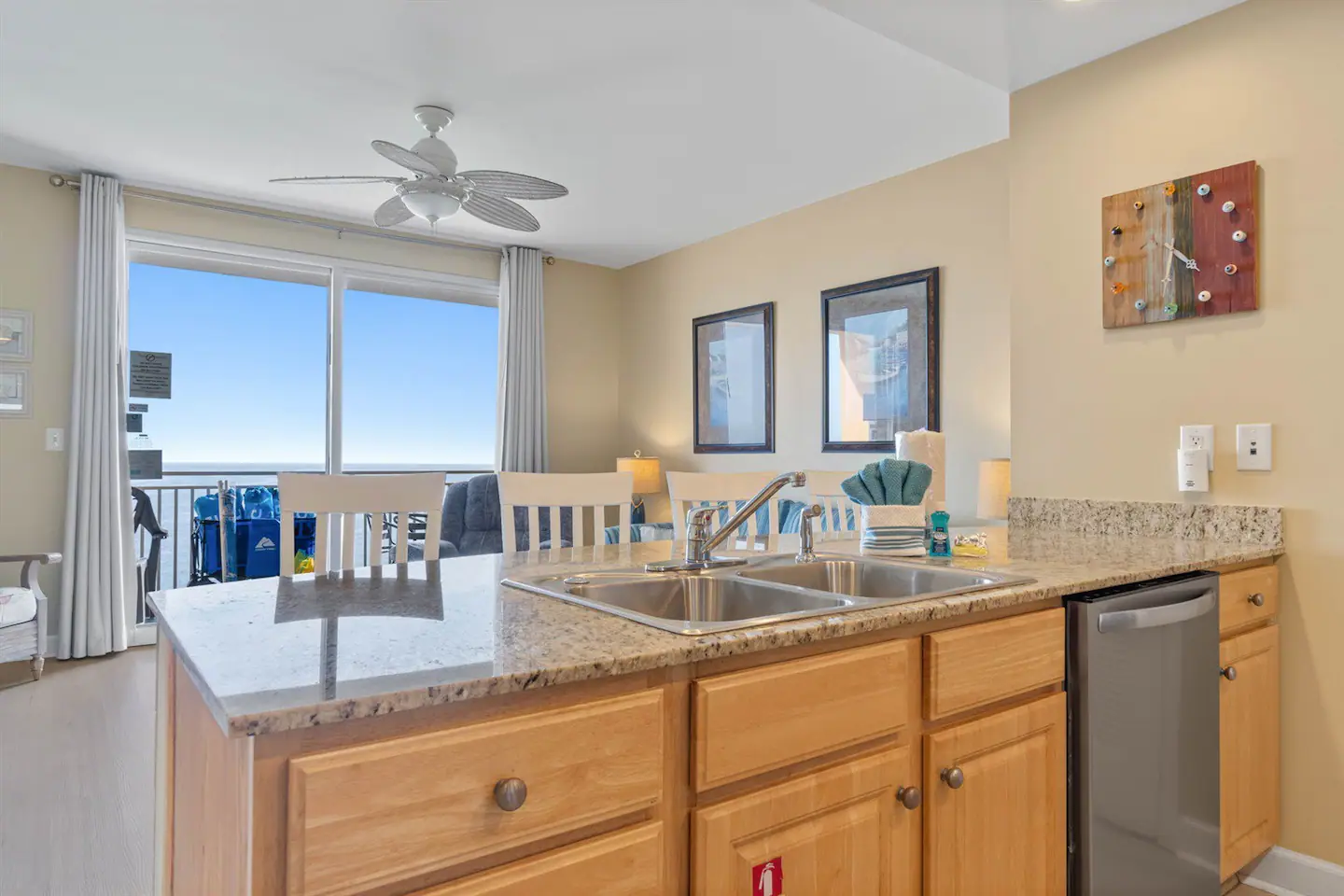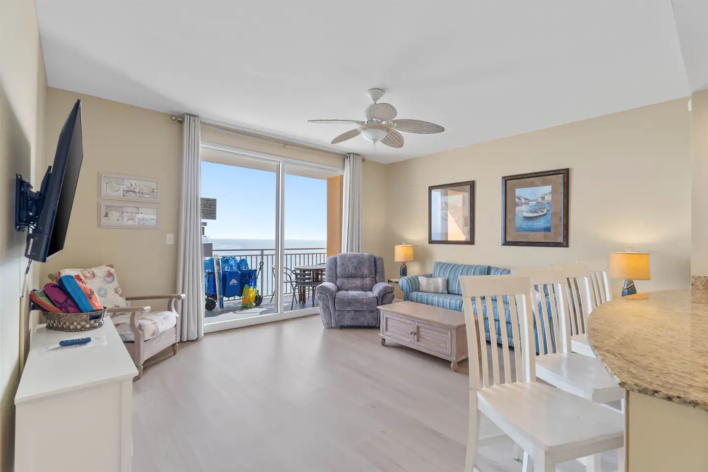 As you step into your luxurious retreat, you’ll find everything you need for a relaxing stay. The condo boasts a fully stocked kitchen, so you can whip up delicious meals and snacks whenever you please. No need to worry about packing bulky beach gear or towels – we’ve got you covered! Plus, we provide a starter pack of toiletries to ensure your comfort from the moment you arrive.